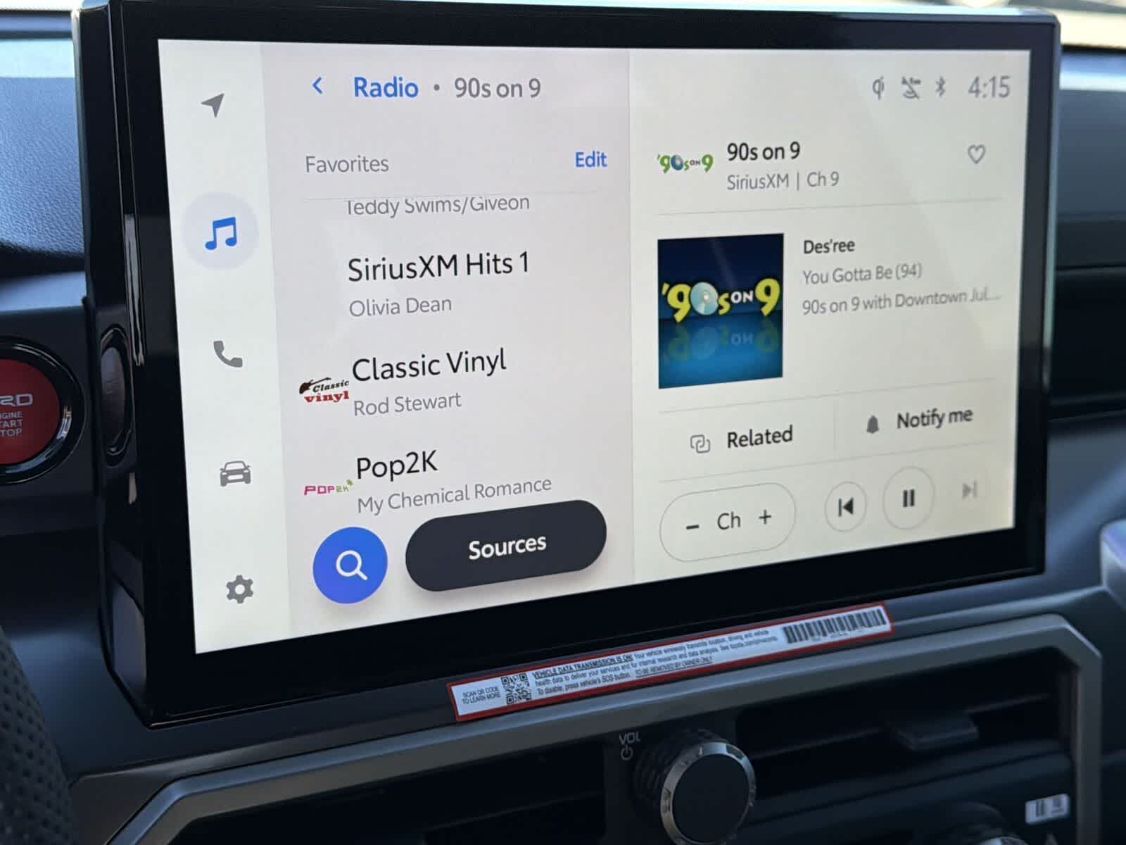4. Wireless use of Android Auto requires a compatible Android 11.0+ phone and compatible active data plan. Check g.co/androidauto/requirements for compatibility. Operability depends on network availability, a cellular connection, and GPS signal. Services vary by vehicle and are subject to change at any time without notice. Data charges may apply. To learn more, go to https://www.toyota.com/audio-multimedia/. To learn more about Toyota's Connected Services data collection, use, sharing, and retention practices, please visit https://www.toyota.com/support/privacy-notice/. Google, Android, Android Auto, Google Maps, and other marks are trademarks of Google LLC. Compatible Android phone and compatible active data plan required.