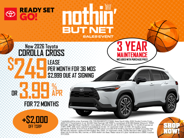 1 available at this price. Example VIN: 7MUDAABG2TV172682. New Sport Utility 2026 Toyota Corolla Cross AWD CVT Transmission 4-cyl. $2,000 Total Savings Off TSRP is comprised of $2,000 Dealer Discount. TSRP: $35,088. See Bell Road Toyota for more details. $15.64/month per $1,000 financed for 72 months financed at 3.99% APR. With down payment acceptable to lender. On approved credit. LEASE: 36 monthly lease payments of $249. Amount due at start, $3,995 which includes first month’s payment and $695 acquisition fee. $0 security deposit. Lease end termination fee, $395. On approved credit. Toyota standard rates apply. Price does not include tax, title, license, or $595 dealer doc fees. Retail value of 3 year maintenance is $985. Expires 3/31/2026.