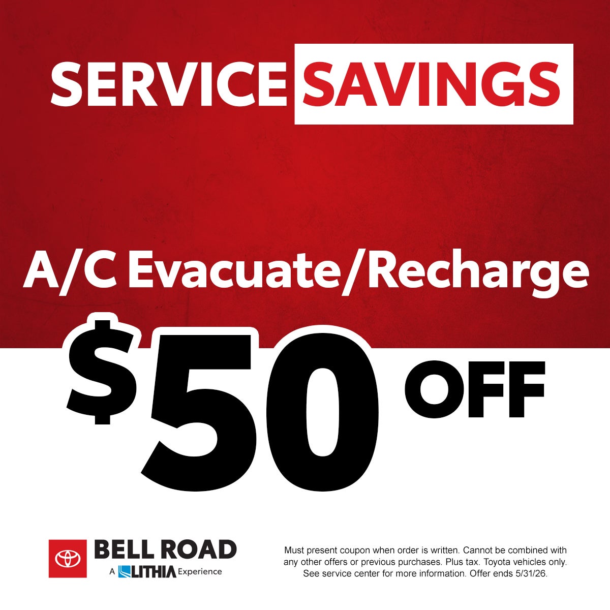 Must present coupon when order is written. Cannot be combined with any other offers or previous purchases. Plus tax. Toyota vehicles only. See service center for more information. Offer ends 5/31/26.