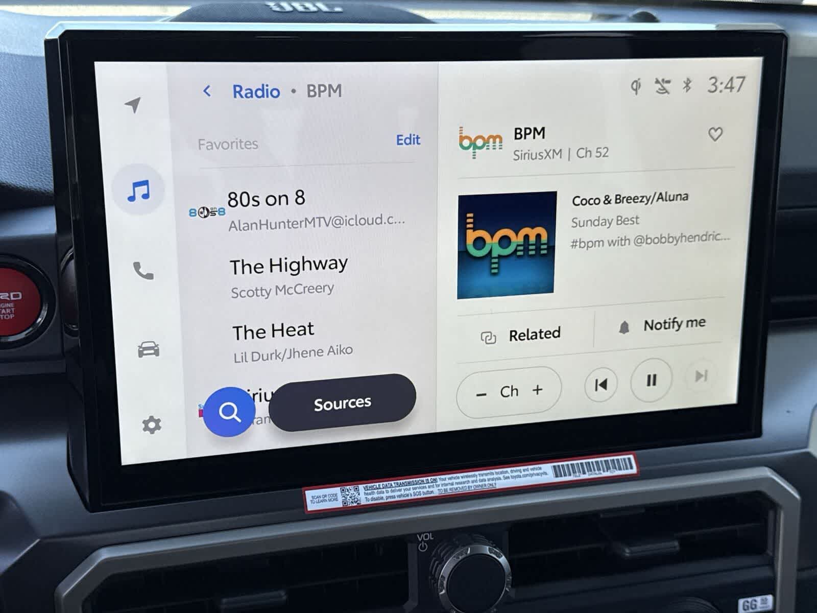 - Radio: 8" Toyota Audio Multimedia -inc: touchscreen, 6 speakers, wireless Apple CarPlay and Android Auto compatibility and SiriusXM w/3-month Platinum Plan trial subscription, See toyota.com/audio-multimedia for details